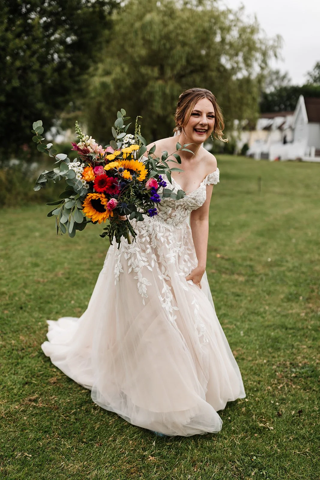 After the “I do’s” and a sea of vibrant ribbon wands (absolutely perfect when you can’t have confetti!) outside the church (cue even more happy tears), everyone made their way to Ashton Keynes Village Hall—the perfect spot for a relaxed, joy-filled reception. No fancy formalities, just long tables, fairy lights, and an atmosphere that felt like one big, love-filled family gathering.